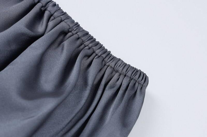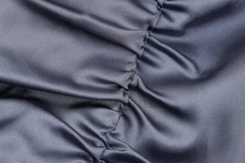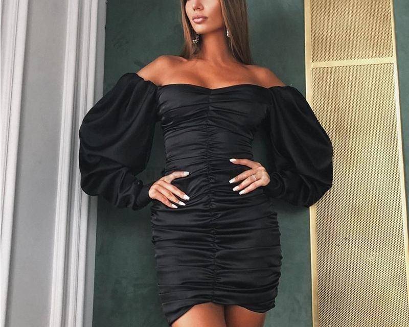 This satin tulip hem mini dress is ideal for a party. With its vertically rushed design and long low puff sleeves not hiding shoulders this dress will never let you unnoticed. Soft and pleasant to touch this dress flatters your figure.