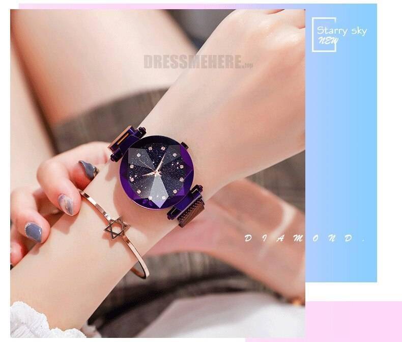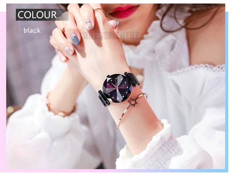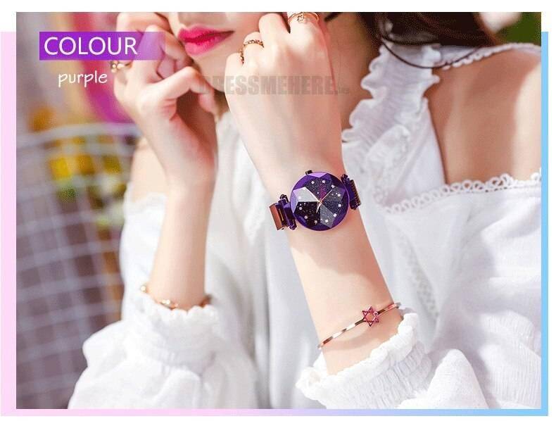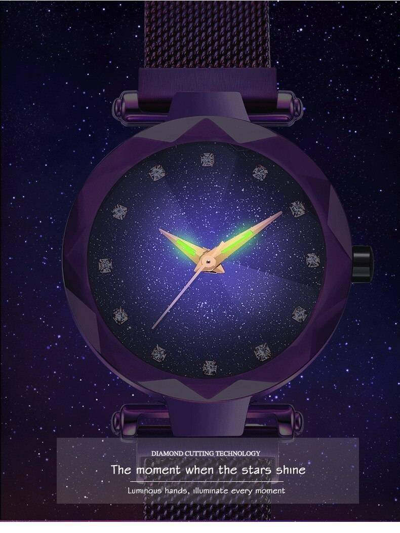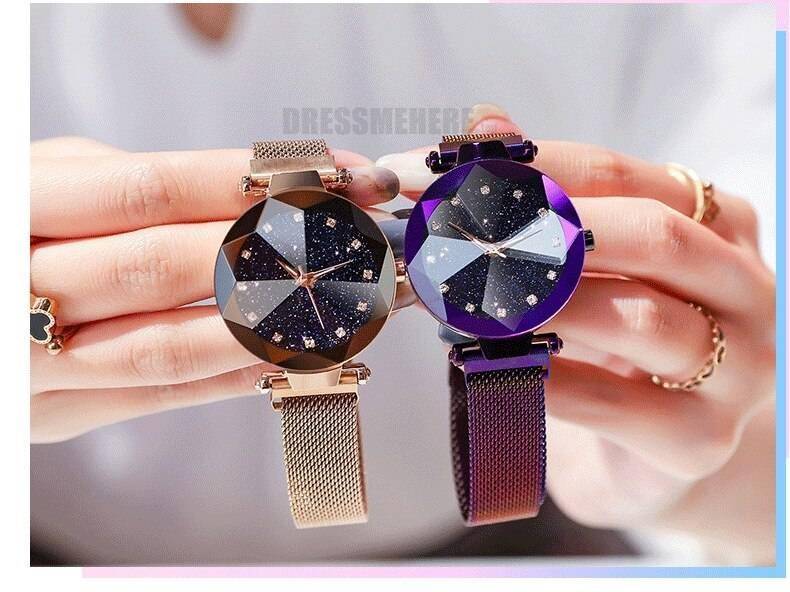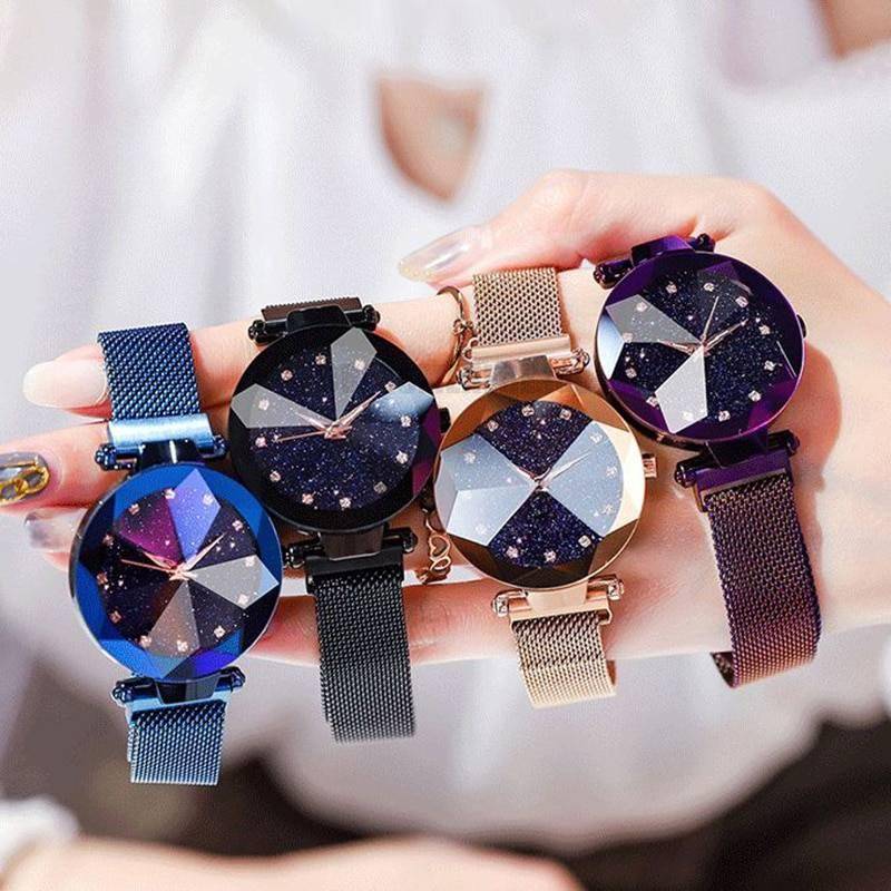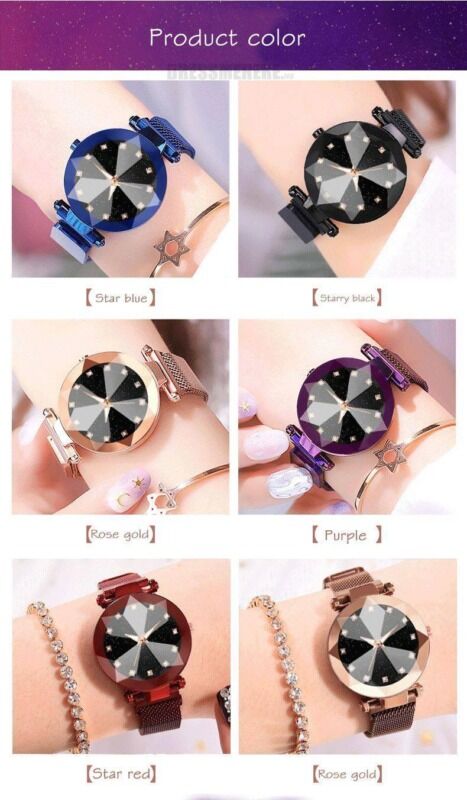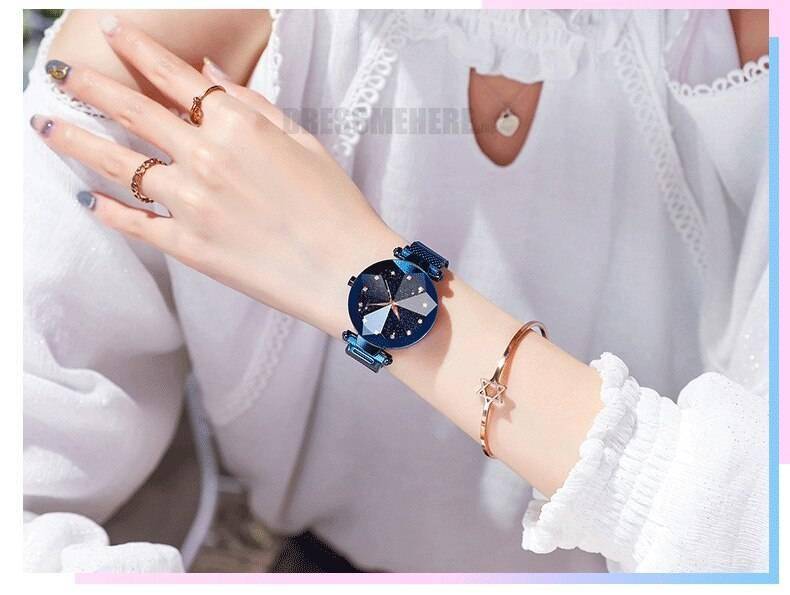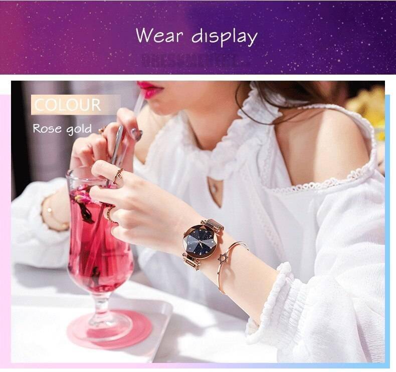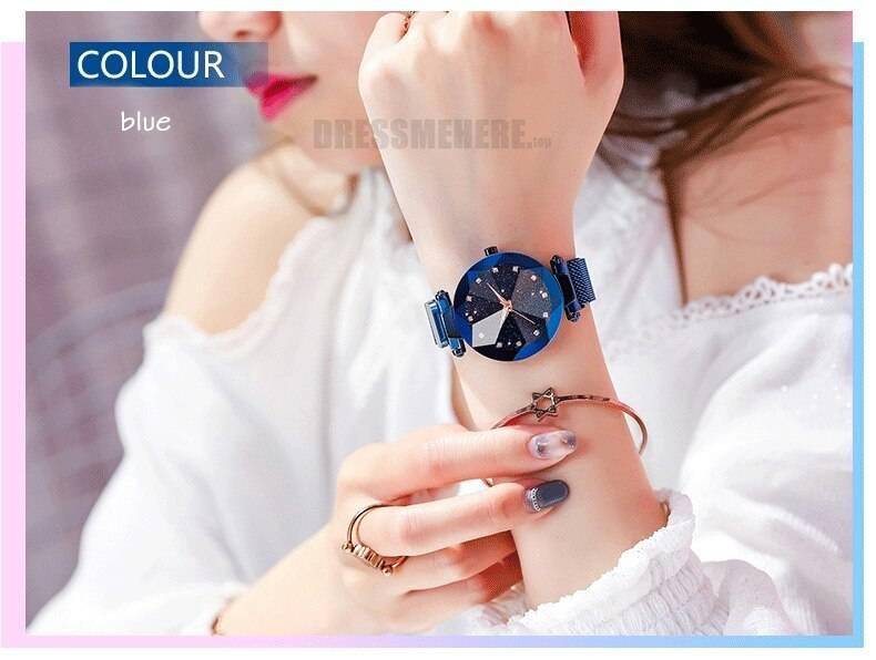 Enjoy the watch featuring the drilled glass mirror, the smooth metal case, the Milanese mesh with magnetic watch buckle, the blue sandstone starry dial, the alloy push crown, the classic three pin design, the luminous pointer display.